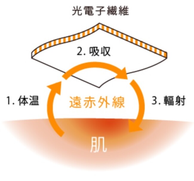 肌から出された遠赤外線(体温)を、光電子繊維に含まれた微粒子セラミックスが吸収し、効率よく自らの身体に戻すふく射を繰り返すことで、体温域の自然なあたたかさが持続します。