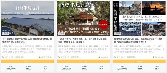 2024年元日に発生した令和6年能登半島地震で被災された事業者がクラウドファンディングを実施する際の手数料が減免となる「令和6年能登半島地震災害支援プログラム」を引き続き実施しています。クラウドファンディングを利用することで、被災地域に思いを寄せる全国の人に支援のきっかけを作ることができます。