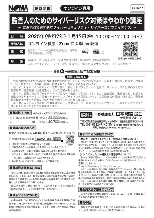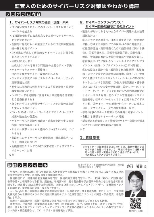 ・セミナー名称: 「監査人のためのサイバーリスク対策早わかり講座: 文系視点で実務的なサイバーセキュリティ・サイバーコンプライアンス」