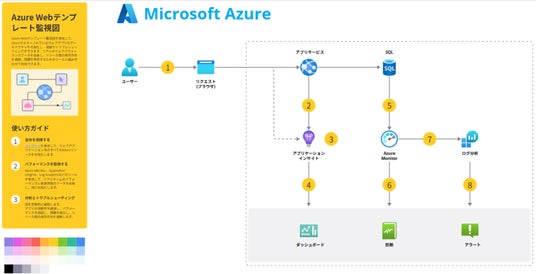 Azureでホストされているウェブアプリのアーキテクチャを可視化し、追跡やトラブルシューティングができるテンプレートです。