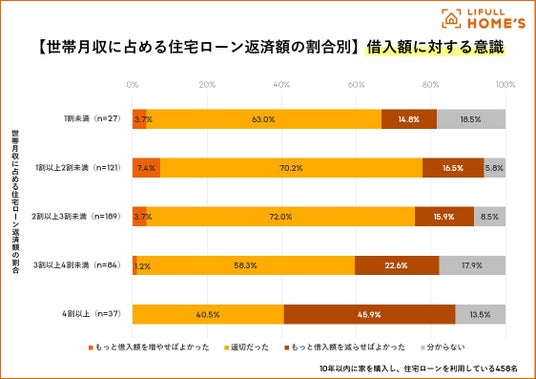 - (購入者のみ)世帯月収に占める住宅ローン返済額の割合:「2割以上3割未満」が最多。3割を超えると「もっと借入額を減らせばよかった」が増加