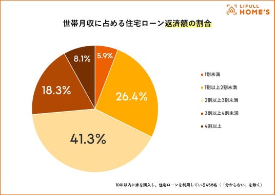住宅購入者に対し、世帯月収に占める住宅ローン返済額の割合を聞いたところ、最も多かったのが「2割以上3割未満」(41.3%)、その後に「1割以上2割未満」(26.4%)となり、「1割以上3割未満」が約7割を占めました。