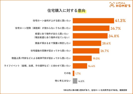 - (購入検討者のみ)住宅購入に対する意向:4割超が「住宅ローン金利が上がる前に買いたい」