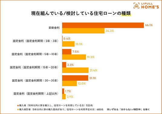 【住宅ローンの種類について】購入者の過半数が「変動金利」の一方で、検討者は30%台に留まる