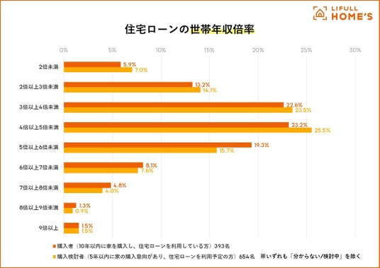 住宅購入者には住宅ローンを世帯年収の何倍で借り入れているか、検討者には何倍で借り入れる予定かを聞いたところ、購入者・購入検討者共に「3倍以上6倍未満」に6割以上が集中しました。