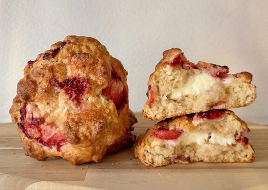 旬の苺を練りこんだ甘酸っぱいストロベリースコーンにミルキーなクリームチーズをサンドして焼き上げた春スコーンです。