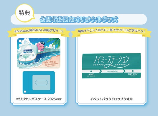 今年の特典は、番組でお馴染みのイラストレーターasuka さんにデザインいただいたパスケース&毎年イベントで使用しているバックドロップ仕様のタオルになります。