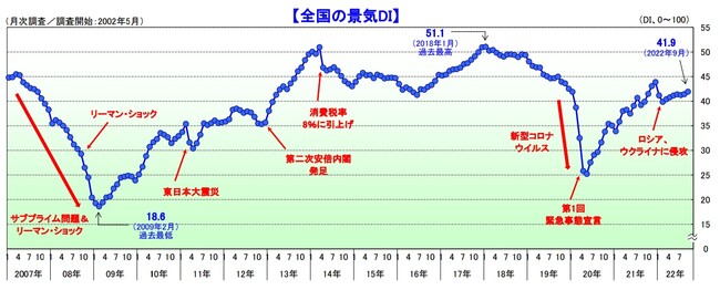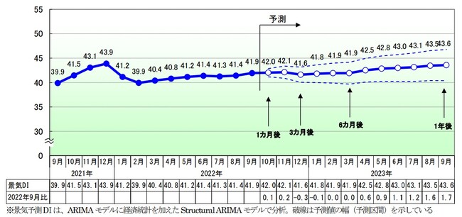 2022年9月の景気DIは前月比0.5ポイント増の41.9となり、2カ月連続で改善した。