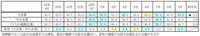 「大企業」(43.6)…前月比0.2ポイント減。2カ月ぶりに悪化。『建設』や『不動産』は、建築資材の不足などで工期の長期化やコストアップの影響が表れた。また相次ぐ食品値上げを受けて飲食料品卸売・小売の景況感が大きく悪化した。