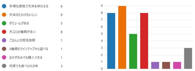 最も多くの票を集めたのは『天丼のたれがおいしい』というポイントでした。以下2位は『手頃な価格で天丼を味わえる』、『天ぷらの種類が多い』でした。