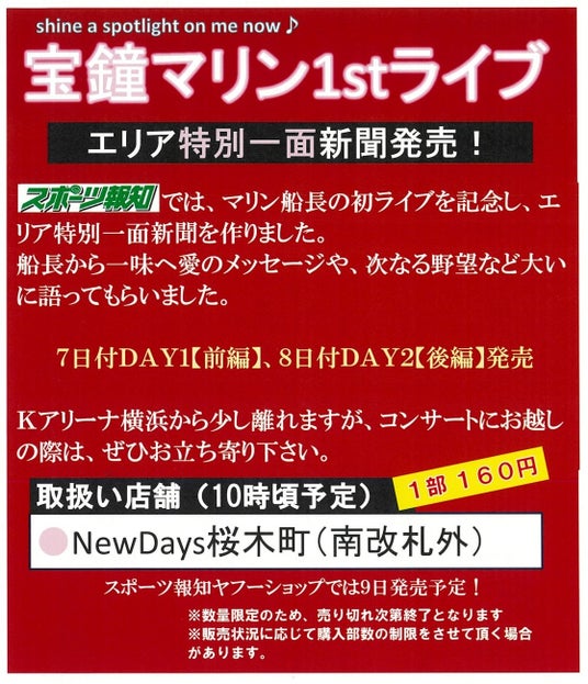 スポーツ報知を発行する報知新聞社(代表取締役社長・依田裕彦)は12月7、8日にKアリーナ横浜で開催される宝鐘マリン公演を記念して、7日に前編、8日に後編を収録した特別1面紙面をNewDays桜木町で販売します。船長から一味へ愛のメッセージやこれからの野望を大いに語っています。お越しの方はぜひお買い求めください。