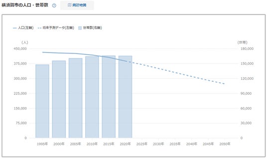 ・1995年から現在までの人口・世帯数の推移と、2025年から2050年までの人口予測を表示