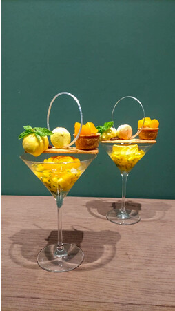 旬のマンゴーを使用した贅沢な大人スィーツ。カクテルグラスにナイトバーを