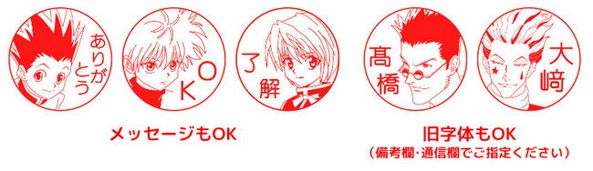 1998年より週刊少年ジャンプ(集英社)にて連載を開始し、冨樫義博氏が描く少年たちの壮大な冒険ストーリー「HUNTER×HUNTER」。「HUNTER×HUNTER はんこコレクション」は、同作を原作として2011年10月から2014年9月まで日本テレビそ他にて放送され、今もたくさんのファンに支持されているTVアニメ「HUNTER×HUNTER」に登場するキャラクターに好きな名前を入れて作れるオーダーメイドのはんこ。