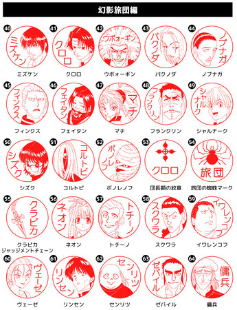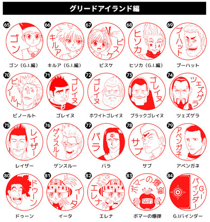 ゴンにキルア、レオリオ、クラピカ、ヒソカなどおなじみのキャラクターに、クロロ、フェイタン、シャルナークなど幻影旅団のメンバーも加わり合計84種類に。サインがわり、お子さまの連絡帳や銀行登録にも使えます