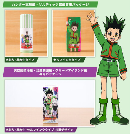 いずれもゴンにキルア、レオリオ、クラピカたちを描いた専用ケース付き。「ハンター試験編」「ゾルディック家編」専用パッケージと、「天空闘技場編」「幻影旅団編」「グリードアイランド編」専用パッケージの2タイプをご用意しました。