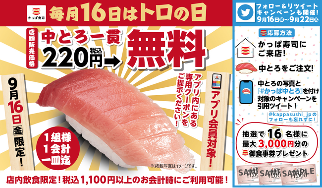 今月の「トロの日」キャンペーンでは、9月16日(金)限定で、かっぱ寿司の店内飲食にて、1,100円(税込)以上ご利用いただき、レジにてかっぱ寿司アプリ内の該当クーポンをご提示いただいたお客様に、かっぱ寿司自慢の豪華ネタ『中とろ』を一皿プレゼントいたします!