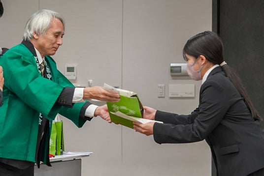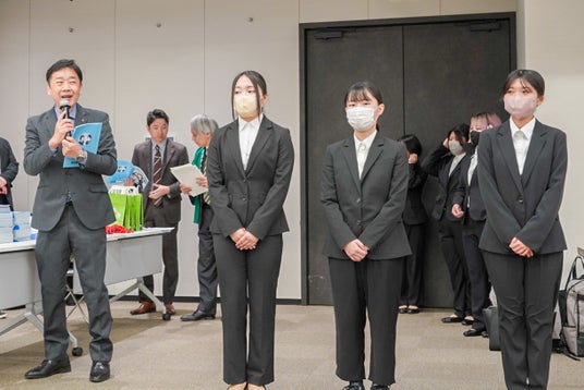 表彰式では、パンフレットの挿絵を担当した松本杏莉さん、パンフレットの表紙を担当した原田桃葉さん、フェアのポスターを丸山愉羽名さんにそれぞれ感謝状と記念品が贈られました。