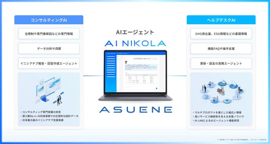 アスエネ株式会社(本社:東京都港区、代表取締役CEO:西和田 浩平、以下「当社」)は、CO2排出量見える化・削減・報告クラウドサービス「ASUENE」に、独自で開発したAIエージェント「AI NIKOLA(ニコラ)」を新たに搭載しました。「AI NIKOLA」は、CO2排出量やESG情報の管理に特化したナレッジAIであり、提案型・伴走型のAIエージェントです。これにより、専門知識がなくても誰でもCO2排出量の見える化・削減に取り組むことが可能になります。