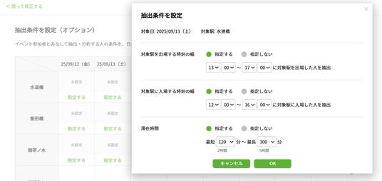 イベント期間や時間帯を指定して駅利用の変化を把握し、マーケティングの高度化に貢献