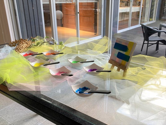 来館されたお客さまには、ヒアリングシートで回答していただいた好きな色を参考に、ウエディングキャンバスを創っていただきます。ウエディングキャンパスにはお二人のために制作した動画のQRコードを貼り、お二人へのメッセージを同封してプレゼントします。