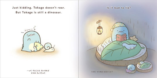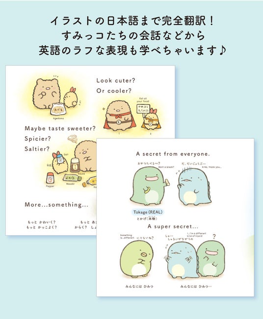 さらに、原作絵本のイラストの文字も完全英訳! えびふらいのしっぽが持っている「やめようたべのこし」という看板や、とかげ(本物)ととかげの「おやつたべる~?」「だ、だいじょうぶ…」といったすみっコたちらしい会話や言い回しからラフな表現も学べます。