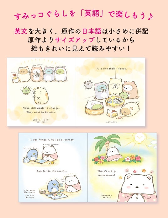 など、英語学習をはじめたばかりのお子さんにも読みやすい英文で、すみっコぐらしの世界を英語で楽しめます。