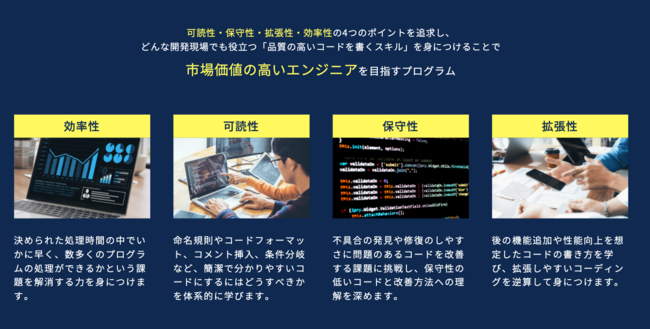 可読性・保守性・拡張性・効率性の4つのポイントを追求し、開発現場で求められる「品質の高いコードを書くスキル」を身につけ、市場価値の高いエンジニアを目指すカリキュラム。開発の経験がある若手エンジニア(業務経験2~5年)を対象に、3月28日からオンラインで開講(定員:20名)予定。