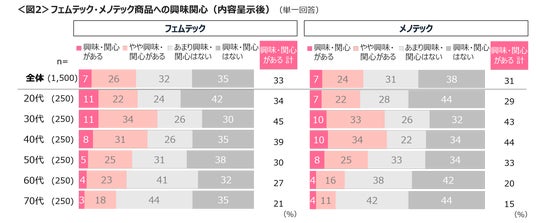 フェムテックやメノテック関連製品・サービスの内容を呈示したうえでの興味・関心は、フェムテックが33%、最も高い30代は45%。メノテックへの興味・関心は31%、30~40代の興味・関心は4割台。<図2>