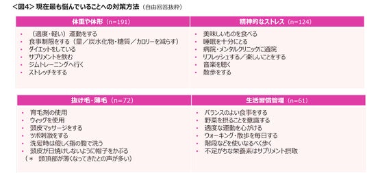 現在最も悩んでいることへの対策方法を自由回答で聴取した結果、体重や体型は「運動をする」「食事制限をする」、精神的なストレスは「美味しいものを食べる」「睡眠を十分にとる」、抜け毛・薄毛は「育毛剤」「ウィッグ」の使用、生活習慣管理は「バランスのよい食事」「野菜を摂ることを意識する」といった声があがった。<図4>