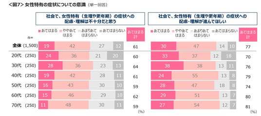 「社会で、女性特有の症状への配慮・理解は不十分だと思う」は61%、「社会で、女性特有の症状への配慮・理解が進んでほしい」は77%と高く、いずれも30代は「あてはまる」気持ちが強い。<図7>