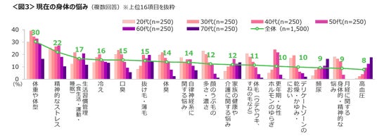 女性の現在の悩みは、「体重や体型」「精神的なストレス」が多く、20~60代は「体重や体型」、70代は「高血圧」が悩みのトップであった。また、20~30代は「口臭」「体臭」「顔のうぶ毛の濃さ・多さ」「体毛」「デリケートゾーンの乾燥・かゆみ・におい」、40~50代は「更年期・女性ホルモンのゆらぎ」が多い。<図3>