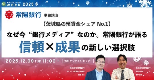 株式会社アイズ(所在地:東京都渋谷区、代表取締役社長:福島範幸、東証グロース:5242)が運営するNo.1*の広告業界のプラットフォーム「メディアレーダー」が主催するマーケティングセミナーイベント「第20回メディアレーダーWEEK 2025 冬」にて、株式会社常陽銀行様が12/9(火)に登壇します。視聴申し込みは無料です。