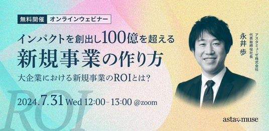 アスタミューゼ株式会社(本社:東京都千代田区、代表取締役社長 永井歩)は、2024年7月31日(水)12:00-13:00に、新規事業担当者、経営企画担当者向けの無料ウェビナー「インパクトを創出し100億を超える新規事業の作り方 ~大企業における新規事業のROIとは?~」を開催いたします。5月に新規開催したウェビナーの再開催となります。