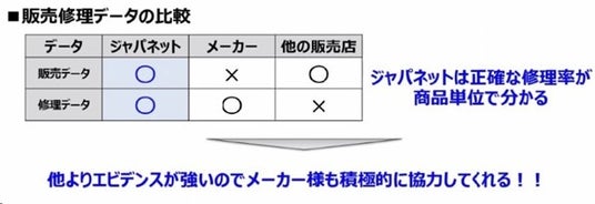 商品の企画・開発にはお客様の声が重要とよく言われますが、ユーザーボイスを聞き取る調査には多大なコストや工数がかかりますし、調査では本音がなかなか聞けないケースも多くあります。また、メーカーでは、卸・小売店への出荷情報はあるものの、お客様の購入情報は持っておらず、アフターサービス部門に入る不具合・修理データとの紐づけが容易ではありません。それらを解決するのがジャパネットのコールセンターです。注文受付に加えて、修理も自社で行っているため、これを一元管理できます。