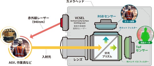 近年、倉庫・工場向けの搬送機器(マテリアルハンドリング機器)や自走ロボット(AGV/AMR)を活用する産業分野において、対象物を認識したり、対象物までの距離を測定したりするなど、高精度な環境認識技術が求められています。しかし、LiDAR(測距センサー)をはじめとする既存の測距技術は、測距には優れているものの、対象物の詳細な識別やカラー情報の取得が難しく、処理負荷やコストの課題もありました。