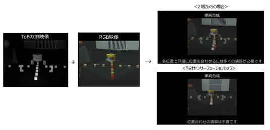 そのような背景のもと当社は、業務用カメラで培った画像処理技術と光学技術を応用した独自技術により、RGBセンサーとToFセンサーを一つのレンズに統合することで、対象物の高精度な3D情報の取得と詳細な画像解析が可能なセンサーフュージョンカメラを開発しました。単眼のため、視差補正などの複雑なキャリブレーションが不要となり、リアルタイムでの安定した測距や画像解析データの取得を実現します。