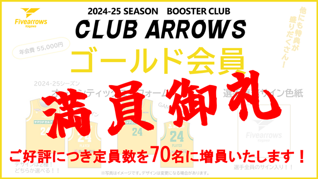 日頃より熱い応援をしてくださる皆さまのおかげで、香川ファイブアローズ オフィシャルブースタークラブ『クラブアローズ』のゴールド会員が定員50名に達し満員御礼となりました!!誠にありがとうございます!!