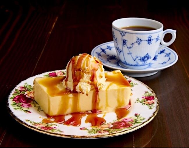 毎日店内のオープンで焼き上げる四角いプリンがコーヒーとともに人気のお店。