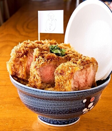 厚さ約5センチ、ボリュームもおいしさも満点のかつ丼。24時間かけて低温調理した豚肉をカラッと揚げ、ゆるゆるの卵を敷き詰めたごはんの上にのせた、かつ丼です。