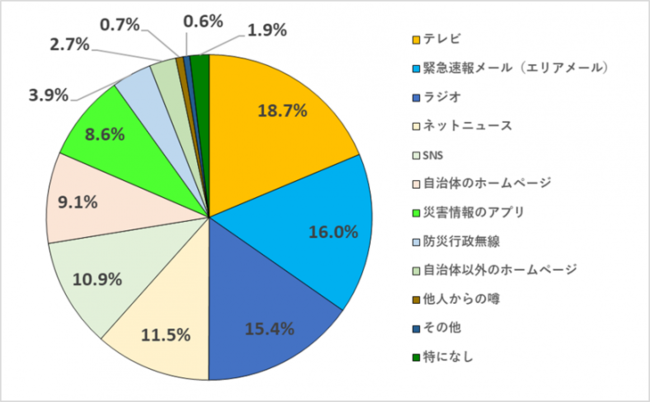 自然災害が発生したときに、情報源として欠かせない媒体は何ですか?という質問では「テレビ」が18.7%でトップとなりました。しかし、2番目以降も「緊急速報メール(エリアメール)」が16.0%、「ラジオ」が15.4%と大差がない結果となりました。