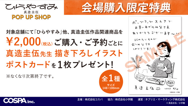 コスパより発売される「ひらやすみ」グッズの先行販売や会場購入限定特典【真造圭伍先生描き下ろしイラストポストカード】もご用意しております!