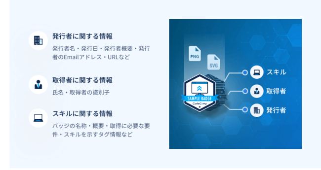 オープンバッジは学位や資格取得などの知識・スキル・経験の証明として、国際標準規格(IMS Global Learning Consortium)に則って発行されるデジタル証明です。このオープンバッジにはSVG・PNGの画像データにJSON-LD形式でスキル証明に関するメタデータが記録されます。メタデータには主に発行者・取得者・スキルの3つが含まれます。