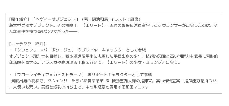 電撃文庫 FC 新作では、新たに「へヴィーオブジェクト」(著:鎌池和馬 イラスト:凪良)から、プレイヤーキャラクターとして「クウェンサー=バーボタージュ」(CV:花江夏樹)が、サポートキャラクターとして「フローレイティア=カピストラーノ(CV:伊藤 静)」が参戦いたします。