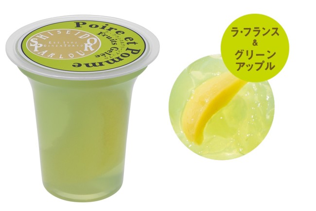 芳醇な香りの山形県産ラ・フランスの果肉を、さわやかな風味の青森県産青りんご・王林果汁のゼリーでとじ込めました。