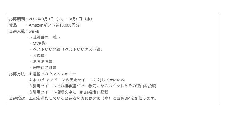 株式会社IBJ(代表取締役社長:石坂茂、東京都新宿区、東証一部:6071)が運営する、日本一*の成婚数を誇る結婚相談所ネットワーク『日本結婚相談所連盟』は、2022年3月1日(火)~3月31日(木)の期間中、全国の加盟相談所と連携した『春の婚活みなおしキャンペーン』を実施。期間中、Amazonギフト券10,000円が5名様に当たるTwitter企画も!