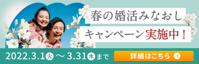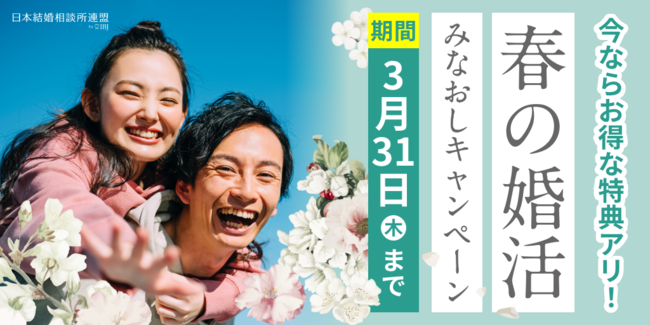 春は気持ちが自然と前向きになり、新しい事に挑戦しようと思える絶好のタイミング。しかし、マッチングアプリや婚活パーティーなど、多くのサービスから選択できる今、ご自身に合う活動方法が分からずにあらゆるサービスを並行することで、婚活疲れに陥るケースも...。そこで、ご自身に合った活動方法で早期に成婚を目指すため、今の婚活をみなおしていただくキャンペーンを実施いたします。