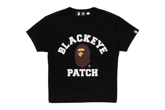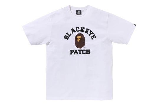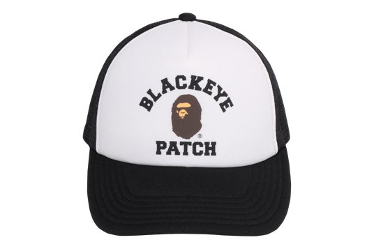 Tシャツとトラッカーキャップには、BAPE(R)の“COLLEGE LOGO”をBlackEyePatch仕様にアレンジしたグラフィックを採用。Tシャツはメンズとレディースの2型で、レディースは、90年代後半に若者の間で流行した“チビT”を彷彿とさせるデザイン