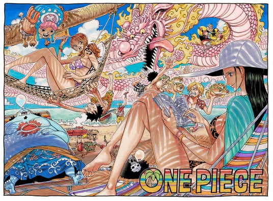 エメラルドグリーンの穏やかな海。ヤシの木陰でくつろぐ麦わらの一味に、龍になったモモの助が乱入します。本を読む水着姿のロビンとナミ。肌に落ちる、ヤシの木の影。