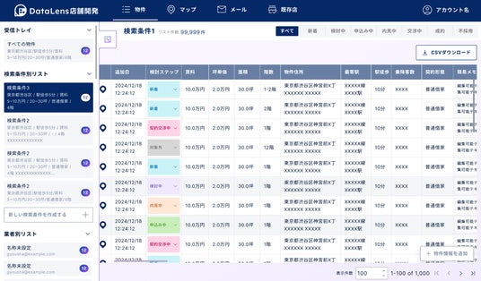 「DataLens店舗開発」は、AI-OCRなどを活用して多様なフォーマットの物件情報を自動でデータ化し、これまで煩雑だった情報抽出の工程を大幅に効率化します。取り込んだすべての物件情報は地図上で可視化され、自社の既存店データや人流、決済といったオルタナティブデータと掛け合わせることで、出店候補地選定を精緻化できます。